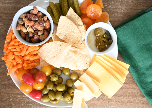 Further evidence of our very high-low tastes, a little snack plate of favorites, including, the sharpest of cheddar, cheetos, and slices of american. We take our cheesy products any which way.