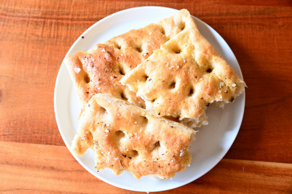 A batch of focaccia made to accompany a delicious fettucini alfredo, with seared scallops. The tops…