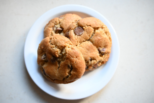 In another effort to reduce our environmental footprint, we traded our gas stove, which had several annoying quirks I won’t get into, and generated a lot of indoor air pollution, with an induction range. There’s been quite the learning curve with the cooktop: heating VERY quickly, boiling water ridiculously fast, burning an item or two, but we are getting there, and could not be more pleased, overall. The oven part, which these chocolate chip cookies serve as testament, bakes quite perfectly and evenly!