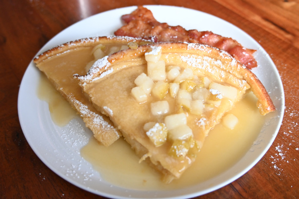 Another oven success, a dutch baby! Look at the steam go… I made a sauce with pears, and Greg did a fine bacon frying job. Happy, happy!