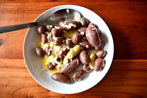 As instructed by Grandmother Hanna, we bought new potatoes and onions, to which Greg and I thought, okay, fine. She prepared them for some lunch or dinner, looking similar to the photo above, only with golden potatoes of very round proportions, and the same generous puddle of butter. Not expecting much besides sustenance, Greg and I tucked in to the most truly amazing potatoes of our life. So creamy! So buttery! And that nice contrasting snap of barely cooked onion! How did they taste so special when all she did was boil them?! Initially, and for many years, we thought we hadn’t found the right potato. But after many tries, with truly great taters, we realized there had to be more to it.