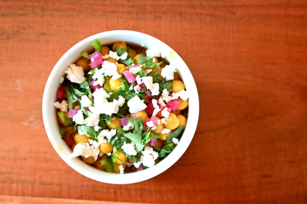 Chickpeas stewed in onion, golden raisins, and Major Grey chutney, with a generous sprinkles of cilantro, pickled red onions, fresh jalapeno slices, and feta cheese. A lovely belly warmer on a freezing winter day.