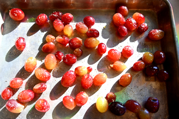 Grapes sprinkled with pulverized dried rosemary, salt, and olive oil, waiting for the oven to heat up and be roasted to perfection.