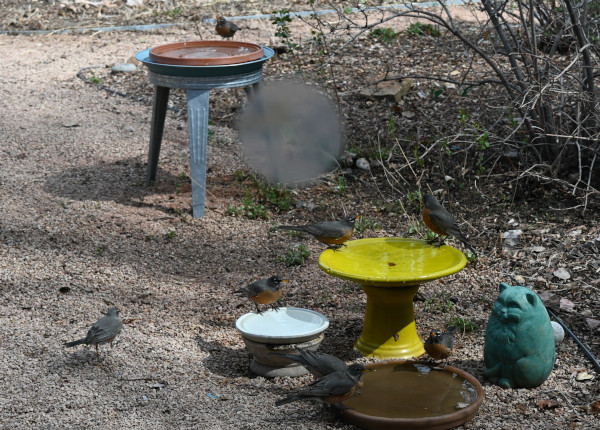 The first of spring brought robin season and their penchant for mass gatherings. It is a very happy time to watch them hopping about and waiting mostly patiently for their kin to take a bath before their own turn comes up.