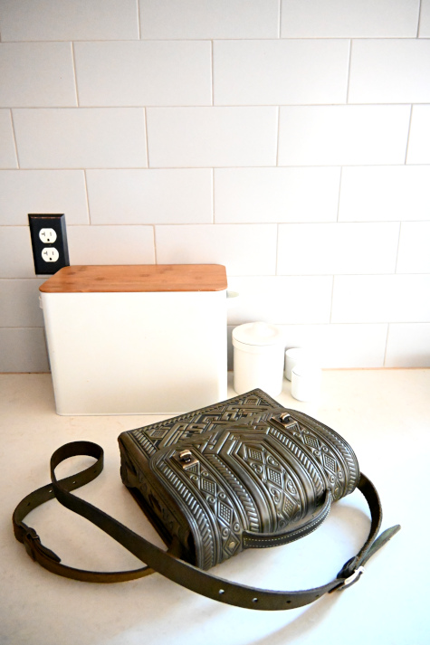 On car outings, we arrive home through the garage, which is right next to the kitchen, and my first stop, though I probably ought to take the additional 20 steps to the door knob of usual storage, is the countertop where I plop my purse. Lucky me, that on this particular day, it was such a nice photo moment! The purse is my very favorite in color and cross-body style, bought several years ago from a company in Ukraine. I have another, as well, in equally beautiful tooled brown leather, a little more hippie, with oak leaves and acorns. I pray for the makers health and safety every time I wear them. Slava Ukraini!