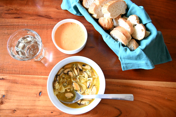 At the store one day they had frozen mussels out of the shells on sale! I made a bouillabaisse kind of soup with fennel and saffron, a little rouille, and we slathered and dipped bread to our heart’s content.