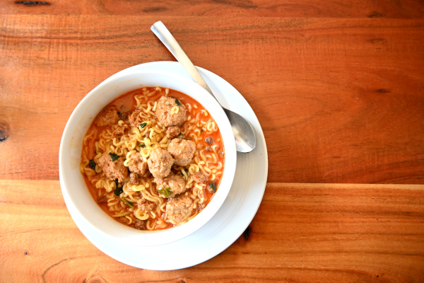 A jazzed up ramen, where I added gochujang to the broth and made bite-size pork meatballs. The tops!
