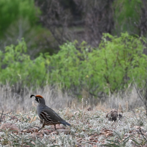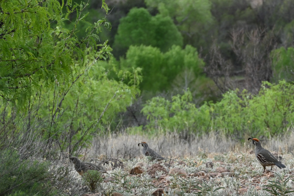 …and what she saw. Bands of regal Gambel quail dashing purposefully toward an abundance of seed.